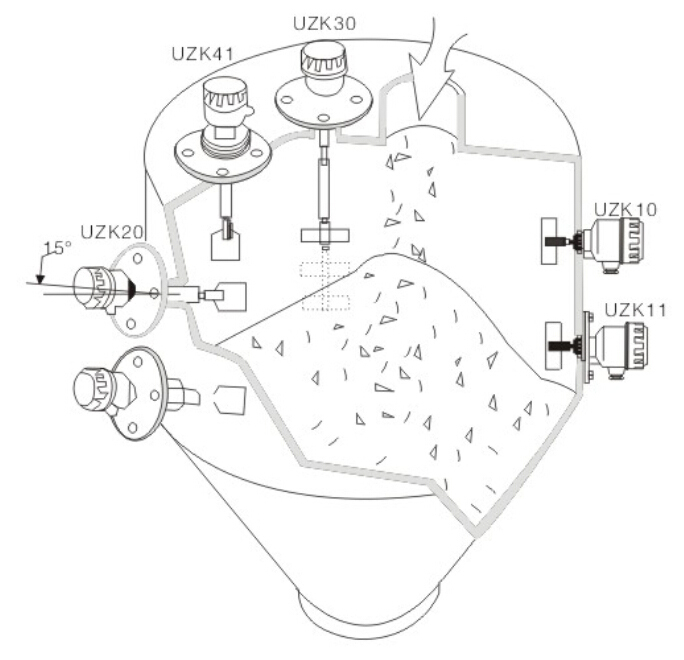 3. 测量粘度较大的粉体时,应从容器的上部向下垂直安装或从侧壁部斜向插入安装。