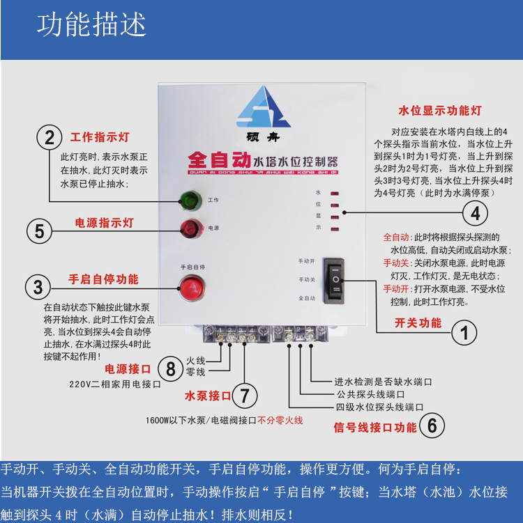 水塔水箱没水了自动或者手动抽,水满自动停;要是抽不上水,控制器也会自动停下保护电机不会空转烧坏(原理:在出水口增加一个检测是否有水源的探片钩,当检测无水时会自动关闭水泵电源)四级水位显示,令您清楚水塔水位高低! | |