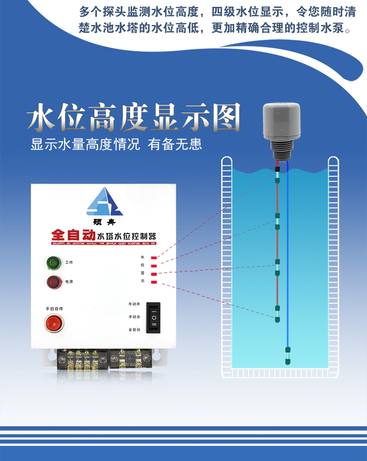 给水塔(水池)供水用的,探头是装在水塔内的;就是当水位下降到低水位时抽水,当水位上升到高水位时停止抽水!只要两条线便可!四级水位显示,令您清楚水塔水位高低! |