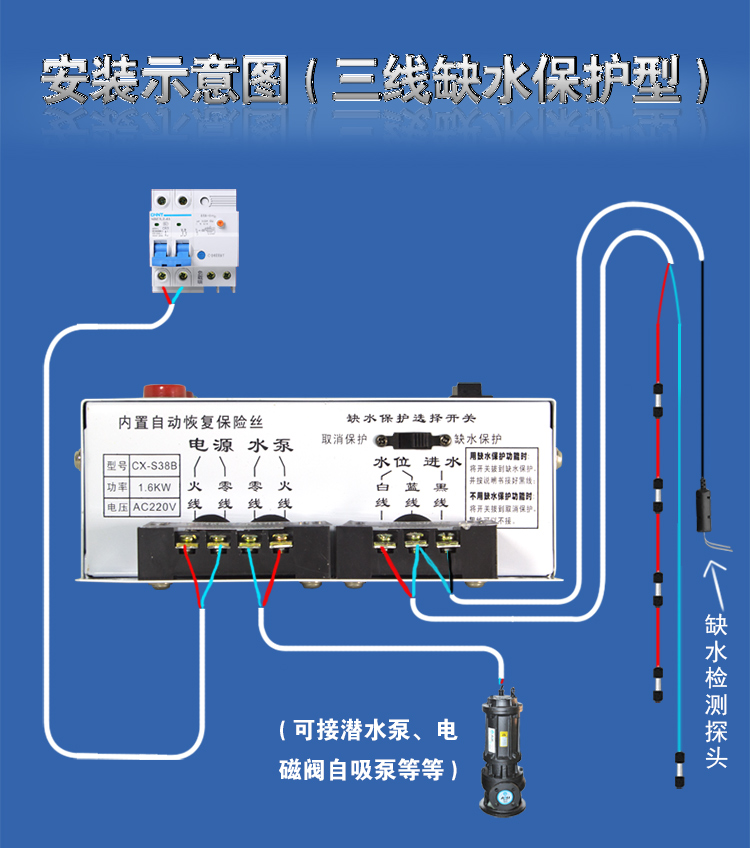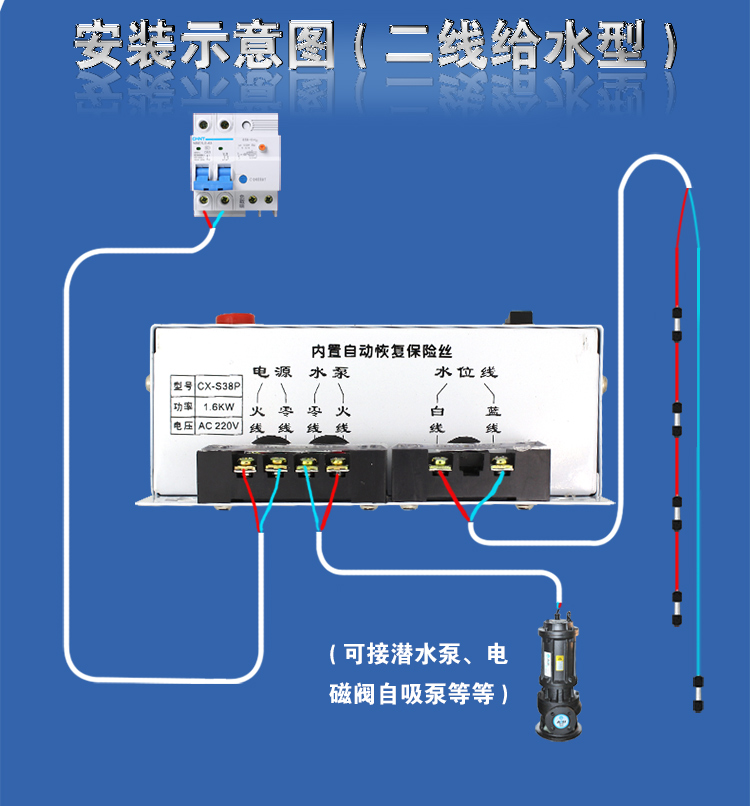 电压:220V,负载功率:1.6KW,可根据水箱、水池的高来选择相应探头线长度 |
