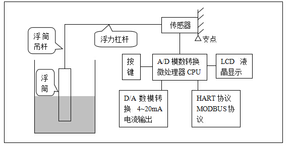 因为浮筒浸没液体的高与所受到的浮力成正比,因此,浮力的变化通过传感器电压输出就变换成对应的液体高,并通过A/D→CPU→D/A转换成标准的4~20mA电流输出,如下图所示: