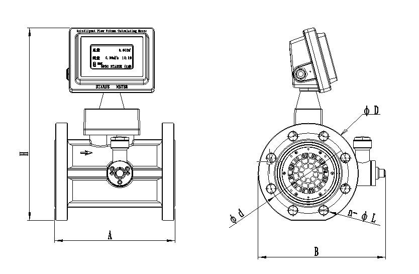 流量计采用法兰连接方式,法兰尺寸执行GB/T 9112~9113-2000标准,流量计外形见图