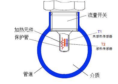 热式流量开关是利用探头温度变化产生差值的原理设计的。在探头内置一个加热元件及两个感热传感器,并与介质接触。热式流量开关工作时,加热元件发出恒定的热量,当管道内没有介质流动时,感热传感器接收到的热量是一个恒定值,当有介质流动时,感热传感器所接收到的热量将随介质的流速变化而变化,感热传感器将这温差信号转化成电信号,在流速到某设定点时,热式流量开关输出开关量信号。